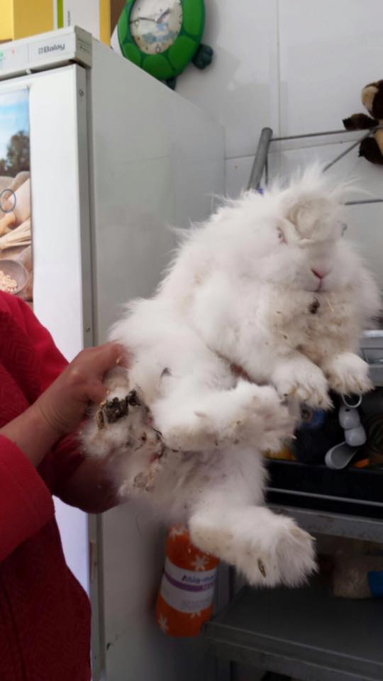 Gasby es un precioso conejo de angora, blanco y de ojos azul...pero nada de esto le ha evitado ser abandonado...no una vez dos veces ha tenido que sufrir lo que es ser abandonado.